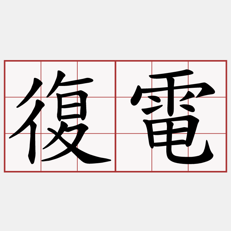 返、還。還原,再回到原來的樣子。回報,多指仇恨而言。免附徭役或賦稅。再、又。無義。有補充或調整音節的作用。《易經》卦名。六十四卦之一。震(☳)下坤(☷)上。機運循環之象。姓。如元代有復見心。(一)之又音。